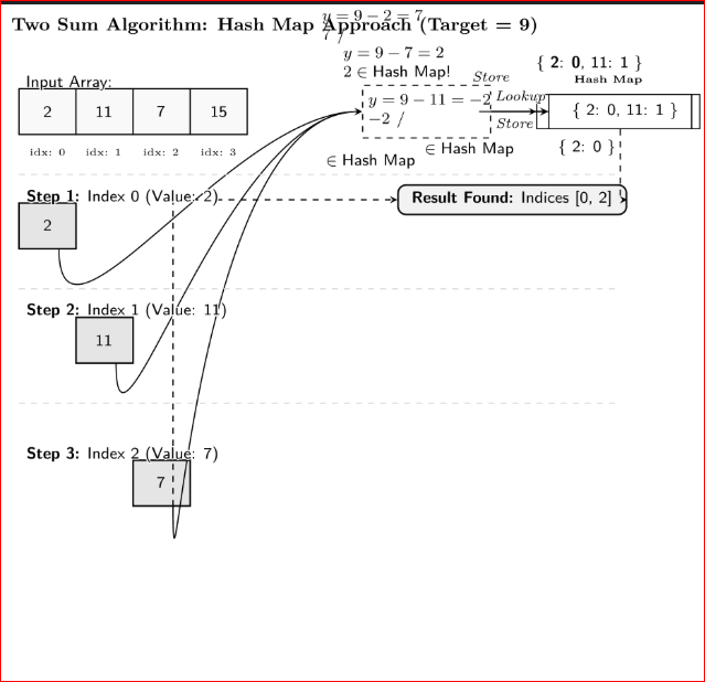 بدلاً من البحث عن y في كل مرة باستخدام حلقة تكرار ثانية، نقوم بتخزين كل عنصر نقوم بزيارته في Hash Map، حيث يكون المفتاح هو قيمة العنصر والقيمة هي فهرسه (index). هذا يسمح لنا بالتحقق من وجود y في زمن ثابت O(1).